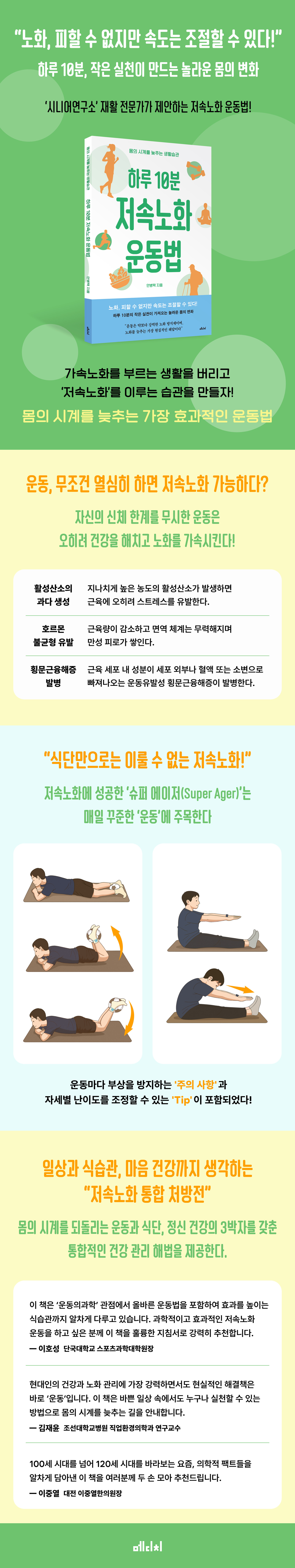 현대인의 건강과 노화 관리에 가장 강력하면서도 효과적인 해결책은 바로 ‘운동’이다. 누구나 따라 할 수 있는 《하루 10분 저속노화 운동법》은 바쁜 일상을 사는 현대인을 위해 가장 과학적이고 효과적인 운동을 제안한다. 연령대별·상황별 적합한 운동을 소개하고 유연성·균형·유산소·근력 운동의 종류와 빈도, 강도 등을 세세하게 다루었다. 또한 가속노화를 부르는 잘못된 운동 습관을 소개하며 근육의 종류를 세부적으로 나누어 우리가 적합한 근육 운동을 쉽게 따라 할 수 있게 돕는다.