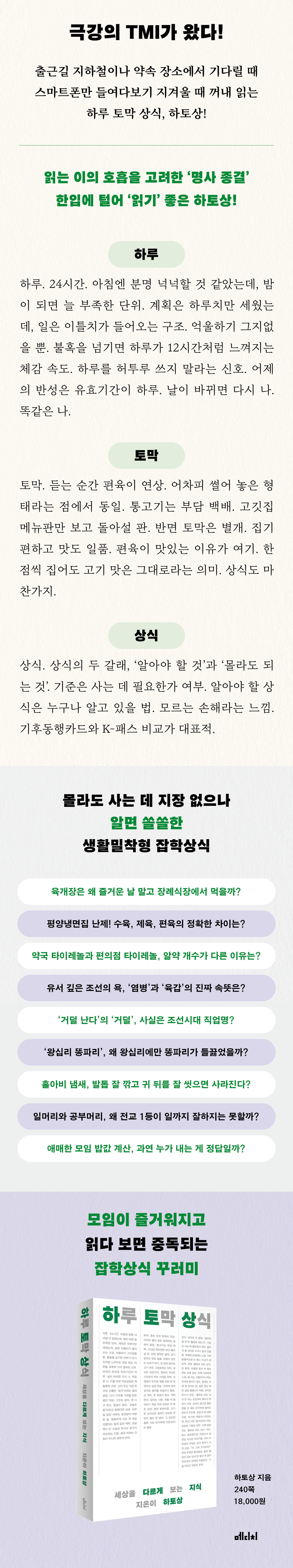 출근길 지하철이나 약속 장소에서 기다릴 때, 스마트폰만 들여다보기 지겨울 때 한 편씩 꺼내 읽기 좋은 ‘하루 토막 상식(하토상)’. 보고, 듣고, 쓰고, 말하고, 먹고 움직이는 일상 전부가 취미인 X세대 직장인의 통찰이 담긴 ‘하토상’은 ‘알 듯 말 듯’한 상식을 다룬다. 몰라도 사는 데 지장 없지만, 알면 재미 쏠쏠한 지식! ‘하토상’의 독보적 특징, ‘명사 종결’ 문체의 생활밀착형 잡학상식을 읽다 보면 어느새 하토상 세계관에 빠져든 스스로를 발견하게 될지도….